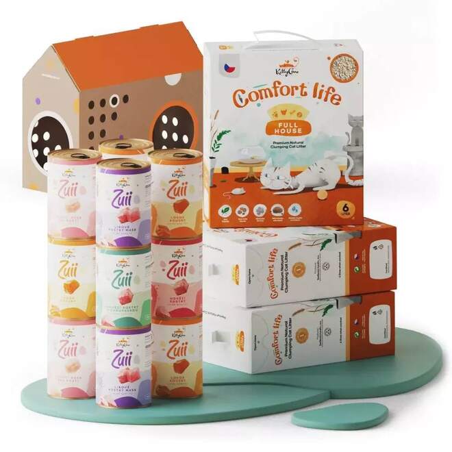 Představujeme vám opravdu velké balení toho, co vaše kočka potřebuje. Prémiové konzervy Zuii plněné jen 100% masem a hned několik balení špičkového hrudkujícího a bezprašného steliva KittyCare. To vše za super cenu a s dopravou zdarma!