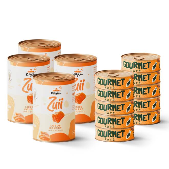 Voňavý úlovek pro milovníky ryb. Čtyři velké konzervy kousků pravého lososa a deset jemných lososových paštik Gourmet, které dodají vaší kočce cenné omega mastné kyseliny pro krásnou srst.