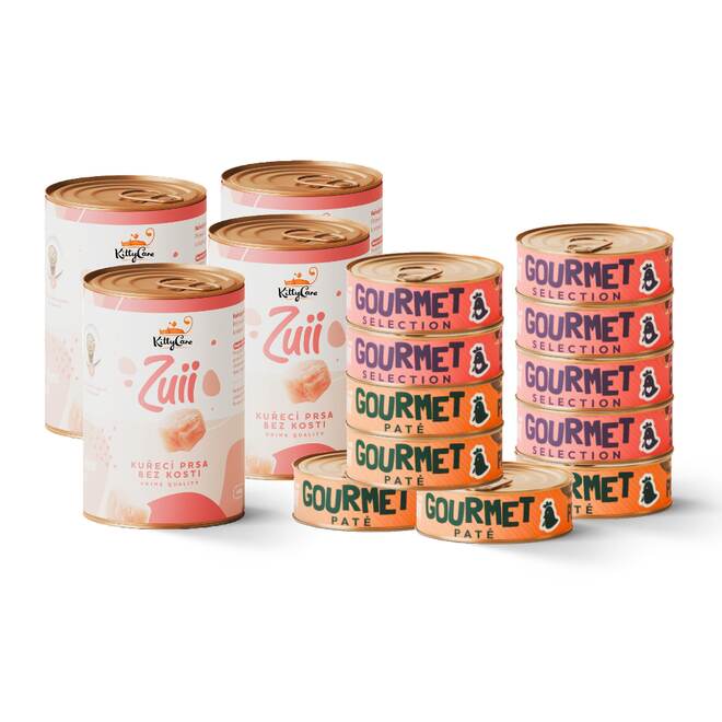Lehká, ale neskutečně chutná drůbeží hostina. Kombinace čtyř velkých konzerv čistých kuřecích prsou a deseti prémiových porcí kuřecích paštik a srdíček Gourmet. Čistý protein, po kterém se zapráší!